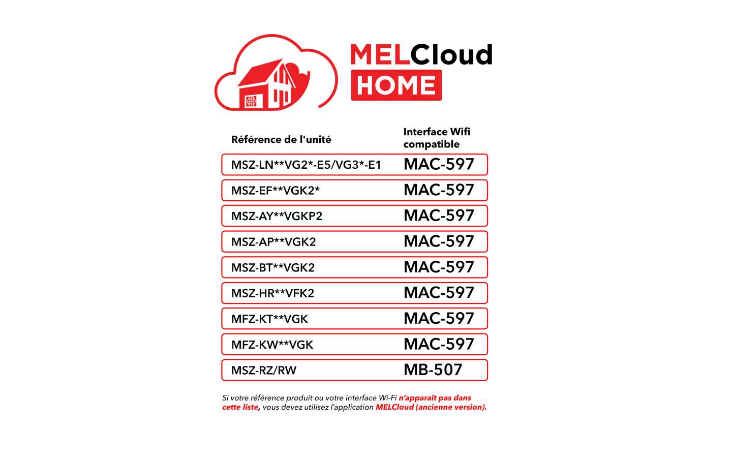 ⚠️ Si votre interface Wi-Fi correspond à l’une de ces références et que votre unité figure dans le tableau de compatibilité, utilisez l’application MELCloud Home.